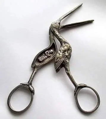 Yet even in forgotten things the old myths live on: Like the little stork scissors that lay overlooked in your sewing kit, or maybe your grandmother's: Gold plated scissors, a stork carved upon them, the screw for eyes, and the blade as beak.